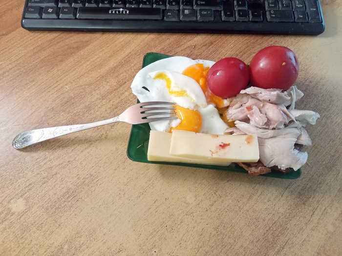 На завтрак покупной салат, два яйца, 50гр. сыра и чашка чая.