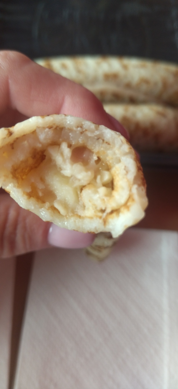 В общем, повадились мы с коллегой завтракать вскладчину. И какое-то время назад прям подсели на блины с начинкой. Получалось, что за 150 рэ на двоих нормальный завтрак, с некоторым даже разнообразием. И попалось как-то мне вот это: