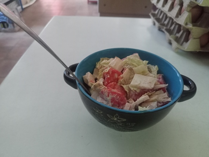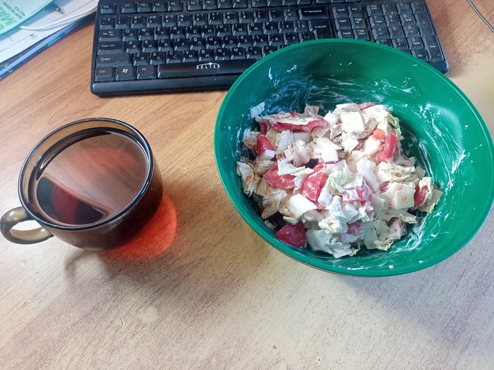 На ужин чашка чая, а также нарезной салат из пекинской капусты, помидор, сметаны и чесночного перца.