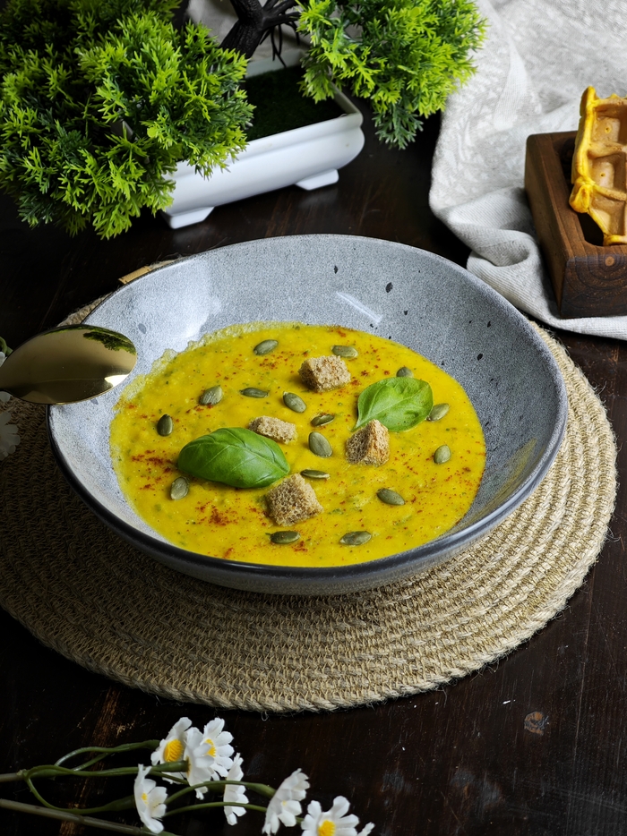 Половником нам крем суп красиво накладываем в тарелку. Украшаем тыквенными семечками, сухариками и листиками базилика. ( я ращу на подоконнике)