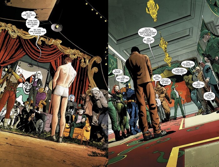Брюс же предложил: “Джокер, Загадочник, убедите меня, что именно ваша идея более привлекательная, и чья идея меня сильнее привлечёт, тому я дам миллиард долларов. Вы что, не понимаете? Этот ушастый псих играет с вами, ждёт, пока вы сделаете за него его работу и поубиваете друг друга!”. Версия Загадочника: “Потому что я труЪ, а Джокер – мошенник, он блефует, он даже не безумец! До настоящего безумия ему далеко”. Версия Джокера – “Потому что я Джокер, а на Загадочника всем насрать, какие ещё нужны причины?”. Брюс пообещал принять решение и перечислить деньги победителю вскорости. “Разумеется, сейчас я победителя не назову, проигравший же меня убьёт”. И враждующие стороны разошлись в ожидании богатства. Вот то, что Бэтмэн тщательно скрывал: на самом деле Брюс устроил эти переговоры, чтобы оценить враждующие стороны и решить, на чью сторону встанет Бэтмэн.