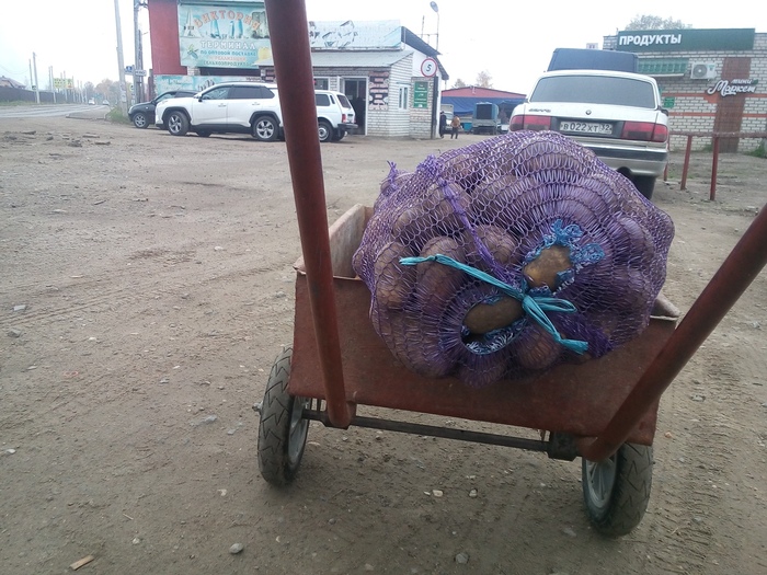 Уже в прошлом сезоне я постарался отказаться от услуг доставки, которая по сути оттарабанивает битую картошку и ошеломлённого клиента по указанному адресу.  К сожалению, от чрезмерных нагрузок на стройке за это время у классической тележки полопались колёса.