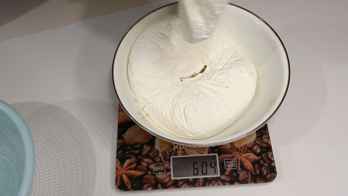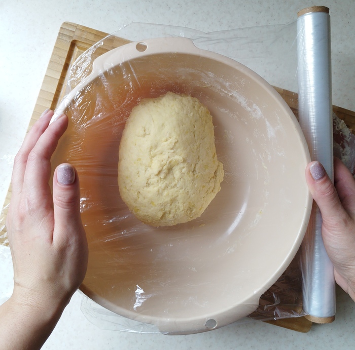 4. Хорошенько вымешиваем, если нужно - добавляем еще муки. Когда остынет - руками. Накрывает плёнкой и даем постоять 20-30 мин.