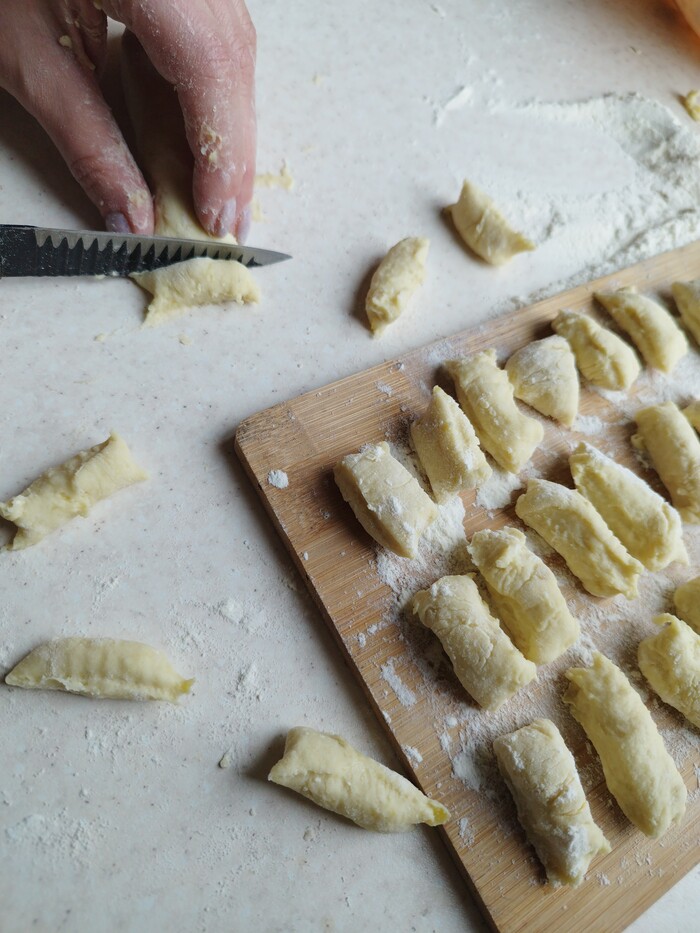 6. Делим тесто на 4 равные части, катаем колбаску и на препыленной мукой поверхности отпиливаем (я это делала тупой стороной ножа) маленькие кусочки.