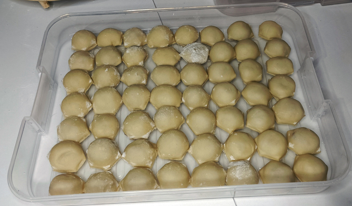 Замесите дрожжевое тесто на сыворотке. Оно должно быть немного липким к рукам. Оставьте тесто подходить один раз, это обязательное условие для заморозки. Затем разделите тесто на три части и раскатайте в лепешки.