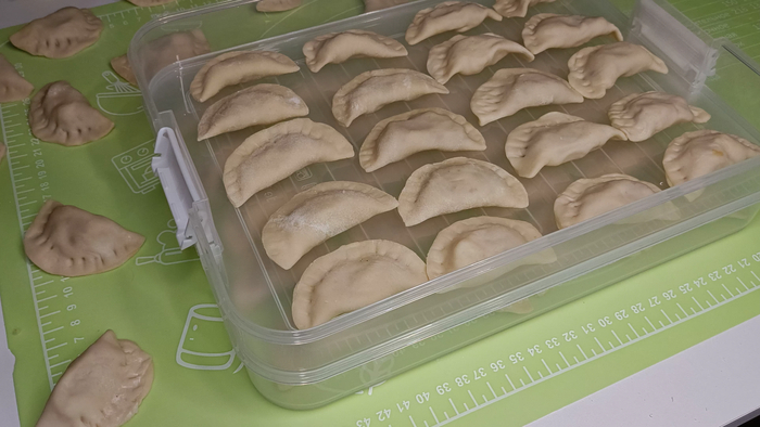 Я приготовила пельмени, вареники, кружочки для пельменей и вареников на следующий раз. Приготовила три пиццы, две заморозила. Сделала творожную массу, заморозила ее, приготовила песочный пирог и заморозила еще две порции для него на будущие. Приготовила рулетики с сыром и зеленью, котлеты с сыром. Также приготовила курицу терияки, апельсиновый соус, чеснок и куриное филе в лимонном маринаде.