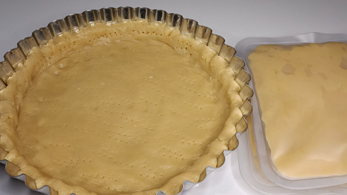 Песочное тесто отлично замораживается, поэтому я решила приготовить тройную порцию. Девять желтков использую сейчас, белки оставляю на потом для меренги. Делю тесто на три равные части, сразу же пеку одну часть пирога, остальное храню в силиконовых пакетах.