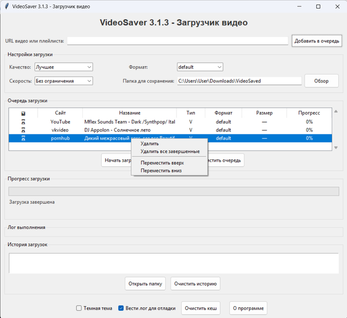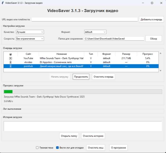 Код практически весь переписан с нуля, сейчас при добавлении в очередь нет подвисания ( реализована параллелизация, один поток парсит url, второй название ). Если добавлен плейлист, то сначала скачивается его адрес, из него выдёргиваются адреса видео и добавляются в список. Списком можно управлять. Встроил ограничитель скорости, так как сжирает весь трафик )) Ну и добавил паузу с возобновлением. По умолчанию запускается без консольного окна и не ведутся никакие логи, для включения есть чекбокс. Есть возможность очистки кеша yt-dlp. Написано на Python 3.10.11 - его api не совместимы с Windows 7, поэтому ни на 7 ни на 8.1 Windows работать не будет. Ютуб для взрослых - просто бонусом, с него тоже скачивает, правда медленнее, чем с остальных сайтов. Для любителей покопаться в коде - в архиве рабочая прога написанная на Python и компилятор в exe, ffmpeg и ffprobe так же в комплекте, если их не будет - программа предложит скачать с github и автоматически установит, правда будет подвисание. При первом запуске будет выполняться установка зависимостей и их импорта, поэтому несколько секунд будет пустое окно консоли.