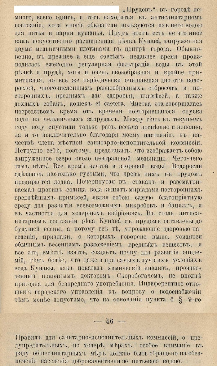 Верстах в двух от города вверх по р. Ушайке, есть большой свалочный пункт, куда свозят в изобилии навоз, и мусор, и всякие иные отбросы. От непрерывных продолжительных дождей шедших в последний месяц, отвал превратился в какую-то зловонную кашу, которая медленно, но постоянно стекает в Ушайку. Вода поэтому в речке невообразимо грязна, по крайней мере в той части Ушайки, которая ближе к указанному пункту. Несмотря на это жители окраинных улиц часто здесь берут воду, детвора, а иногда и взрослые купаются, причем, как неоднократно наблюдали, после купания на теле выступает какая-то сыпь... К речной грязи, несущейся с отвала, в городе присоединяется грязь, спускаемая в Ушайку из бань Муковозова."