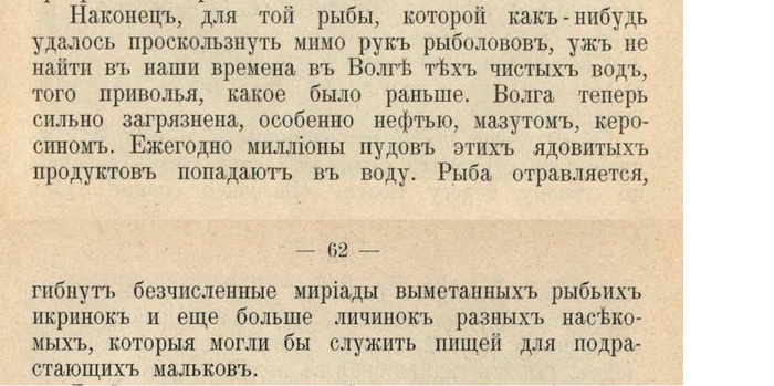 "На днях сообщалось о том, что в реке-Москве появилась масса дохлой рыбы, вследствие того, что вода в реке-Москве начала отравляться отработанным фабричными водами и, наконец, нефтью. Дохлая рыба, вследствие жары, быстро разлагалась, издавала зловоние, отравляя на далекие расстояние воздух."