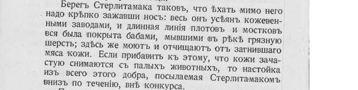 "Обыватели улиц от Преображенской пл. до Богородска очутились в безвыходном положении. На берегу Яузы открылся кожевенный завод и удушливая вонь от моченых кож настолько отравляет воздух, что подчас в буквальном смысле все задыхаются."
