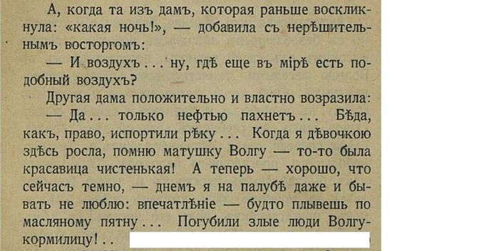 Пароходы бр. Нобель "Вандал", "Сармат", "Ундина" и др., совершающие ежедневно свои рейсы от Шлиссельбурга до Петербурга, отапливаются нефтью и по пути без зазрения совести выбрасывают огромное количество нефти в р. Неву, отравляя тем самым и воду и рыбу. Дачники прибрежных местностей весьма часто по нескольку часов сидят без воды во избежание отравления.