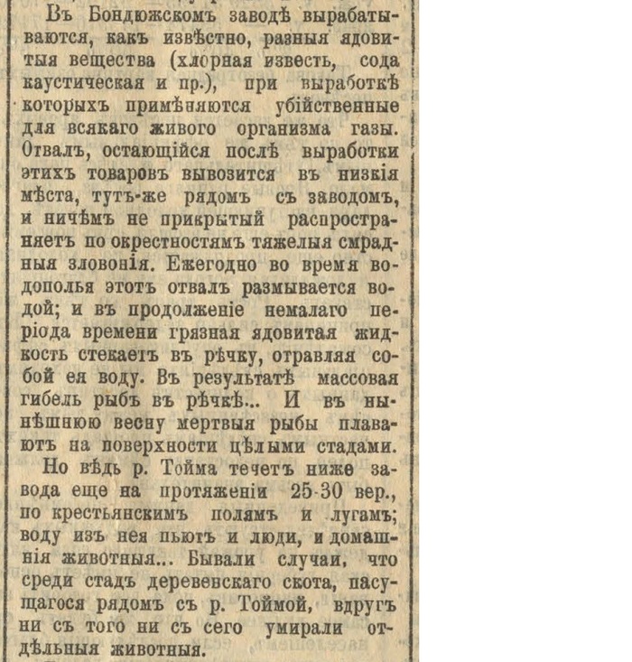"Из Иванова- Вознесенска: Наступили летние жаркие дни и опять начинается в нашем городе старая, но вечно новая и недопустимая — казалось бы, с точки зрения права и здравого смысла — история. Протекающая центром города река Уводь, донельзя изгаженная отбросами от фабрик, под влиянием жары начинает издавать невозможное зловоние. Сейчас, в начале лета, р. Уводь уже имеет вид какой-то ядовитой клоаки: вместо воды в ней темно-шоколадный кисель, с какими-то отвратительными грязно-белыми лишаями на поверхности. Вся эта клоака издает ужасный, головокружительный и тошнотворный запах. В середине лета запах еще усилится и разольется по всему городу."