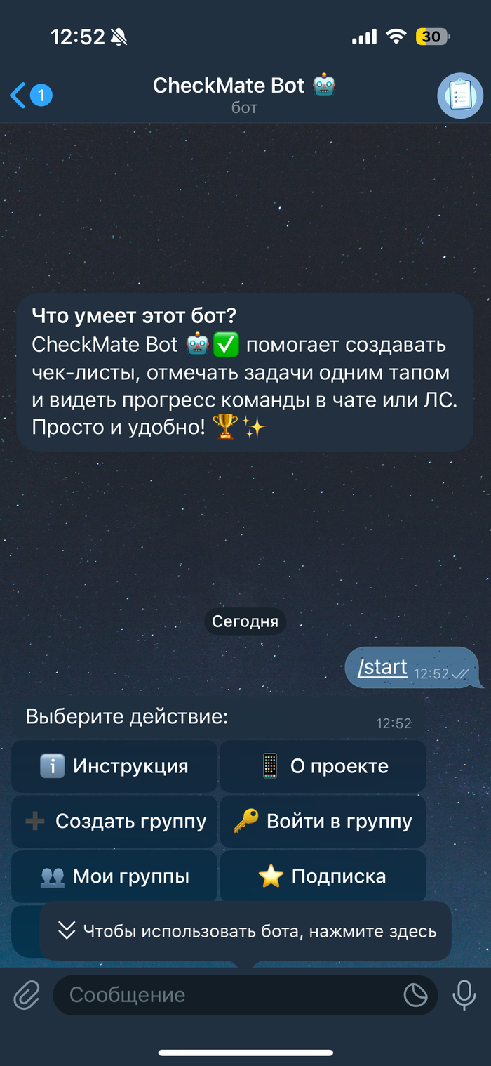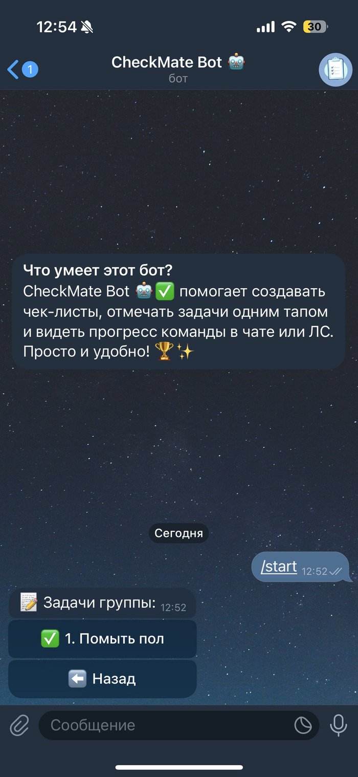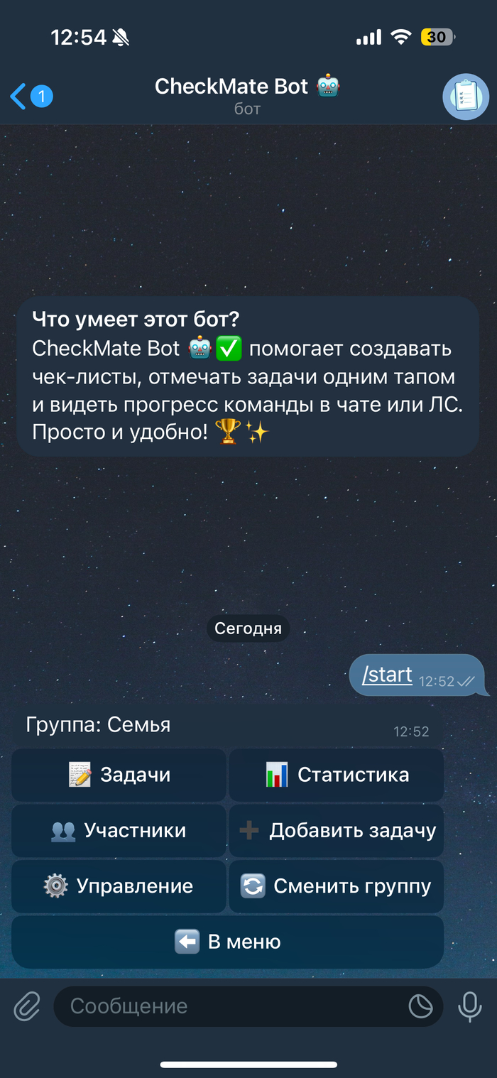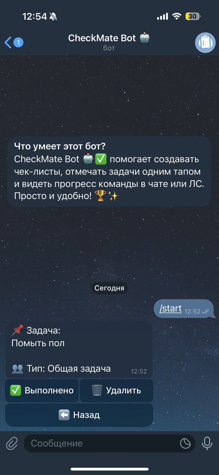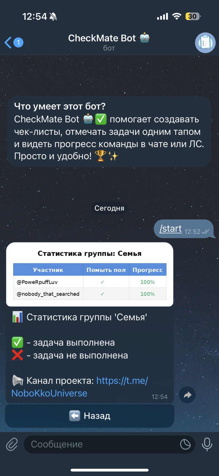 Знакомьтесь: CheckMate Bot от NoboKko Universe — это Telegram бот для управления групповыми чек-листами. Позволяет создавать группы, добавлять задачи (общие и персональные), отслеживать их выполнение и просматривать статистику