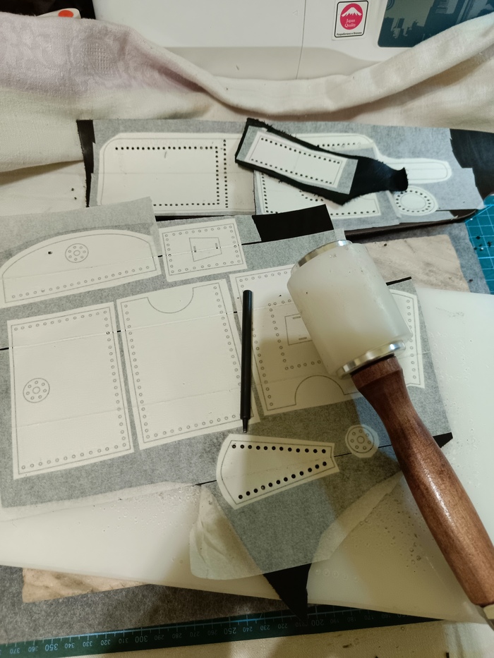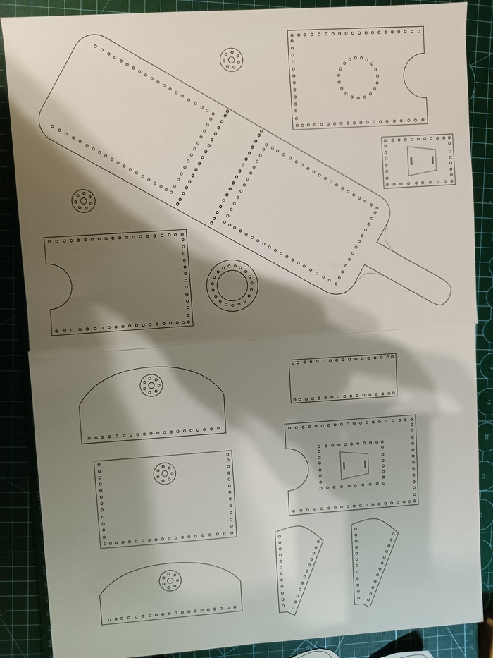 В этот раз деталек побольше и чтобы не столкнуться с "ой, этот кусок кожи испортился, а можно мне ещё один?" предварительно пробуем выклеить полученное из бумаги.