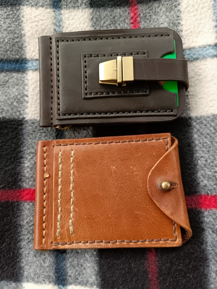Зажим для купюр - одна из самых распространённых штук, которые делают начинающие кожевники по статистике. Когда - то подобное делал и я. Была возможность сравнить с тем, что было в самом начале эпизодического ковыряния с кожей и нитками. Пару лет разницы.
