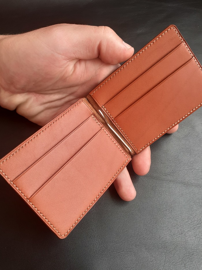 В какой то момент я рискнул и купил для себя итальянскую кожу (изначально я не знал, что у РБ магазина она оттуда, это про пропуск ранее) , и купил buttero museum blue , и тут как раз у товарища юбилей, и он фанат wh40k, я заморочился и нашёл золотистые нитки вощенные, оказались vinymo MBT, понравились, и я сшил зажим для денег в стиле ultramarine' нов, считаю это изделие пока вершиной своего мастерства..