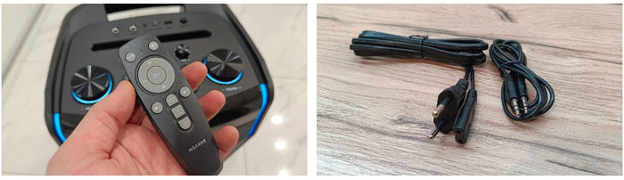 Пульт очень компактный, но в тоже время очень функциональный. Есть основные режимы, управление подсветкой, громкостью и переключение треков. Батареек в комплекте нет, поэтому придется использовать свои 2 мизинчиковые батарейки. Из проводов нам предлагают AUX с обоюдным mini jack 3,5 и сетевой кабель питания на 220В. Заряд аккумулятора колонки происходит за счет подключения к электрической розетке.