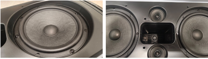 Низкочастоные динамики диаметром более 200 мм. Также на резиновых подвесах с ферритовыми магнитами. Сопротивление 4 Ом и заявленная мощность по 50 Вт каждый. Оба динамика свежие, от июня 2025 года.