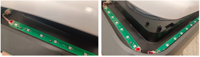 Заглянем внутрь колонки. Сразу скажу, что до электроники колонки не не получилось добраться, так как частично элементы имеют герметизацию. А вот маркировку динамиков и подсветки мне получилось увидеть. Для этого с тыльной стороны или с лицевой откручиваем все винты. Если с лицевой стороны снять металлический гриль и поднять пластиковую накладку, то можно увидеть светодиодную подсветку. Выполнена она на отдельных платах с использованием RGB чипов. Соединение между платами выполнено шлейфами и пролито лаком.