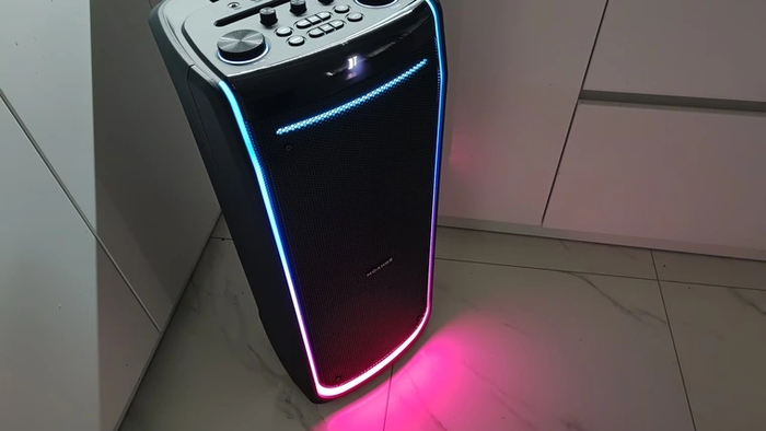 Лицевая часть закрыта металлическим грилем. Под ним 4 динамика с фазоинвертором. RGB подсветка распространилась вокруг металлической защиты, имеет несколько режимов работы и даже диммер.