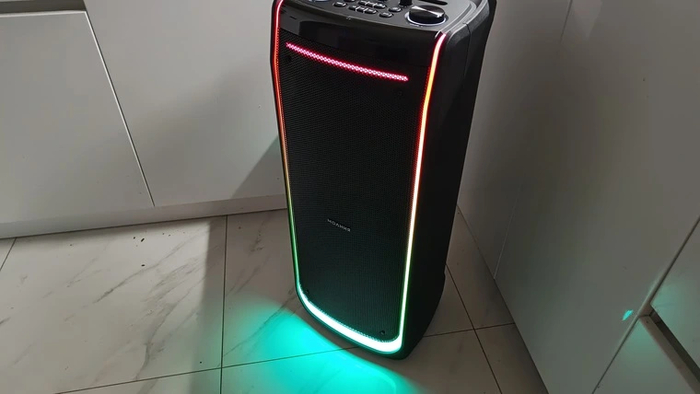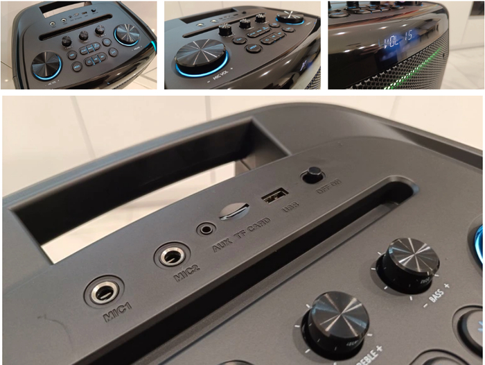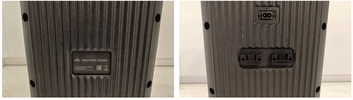 УРАЛ Молния 10000 полностью выполнена из пластика, но, это толстый пластик. Нет ощущения "барабана" когда стучишь по стенке. И действительно, внутри можно увидеть множество ребер жесткости, а на тыльной стороне рифленую заднюю стенку. На верхней части можно увидеть массивную ручку для переноски, а также пульт управления выполненный в диджейской тематике. Есть небольшая подсветка, что значительно упрощает управление в темное время суток.