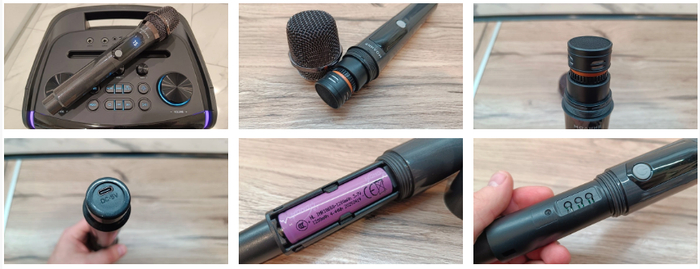 Комплектный беспроводной микрофон работает на аккумуляторе 18650. Уже установлен и заряжен. Заявленная емкость аккумулятора всего 1200 mAh, но и ее должно хватить не на одну вечеринку. Аккумулятор съемный и может быть заменен на аналогичный или большей емкости. Ветрозащита микрофона из металлической сетки, внутри слой поролона. Головка микрофона дополнительно обклеена поролоном. С торца есть разъем USB для зарядки. С обратной стороны под защитным колпаком есть скрытые кнопки настройки. Как звучит микрофон можно будет увидеть чуть ниже.