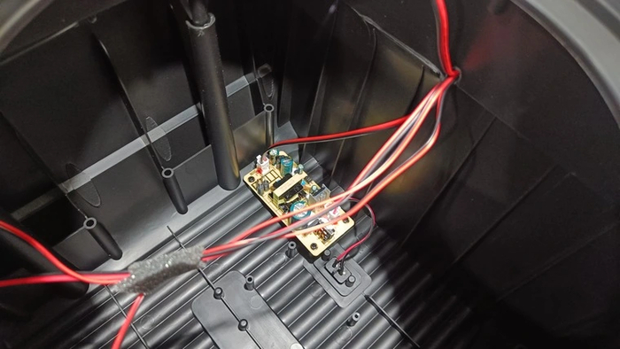 Внутри на задней стенке видна ребристая поверхность, а также плата питания. Сам аккумулятор вынесен в верхнюю часть.