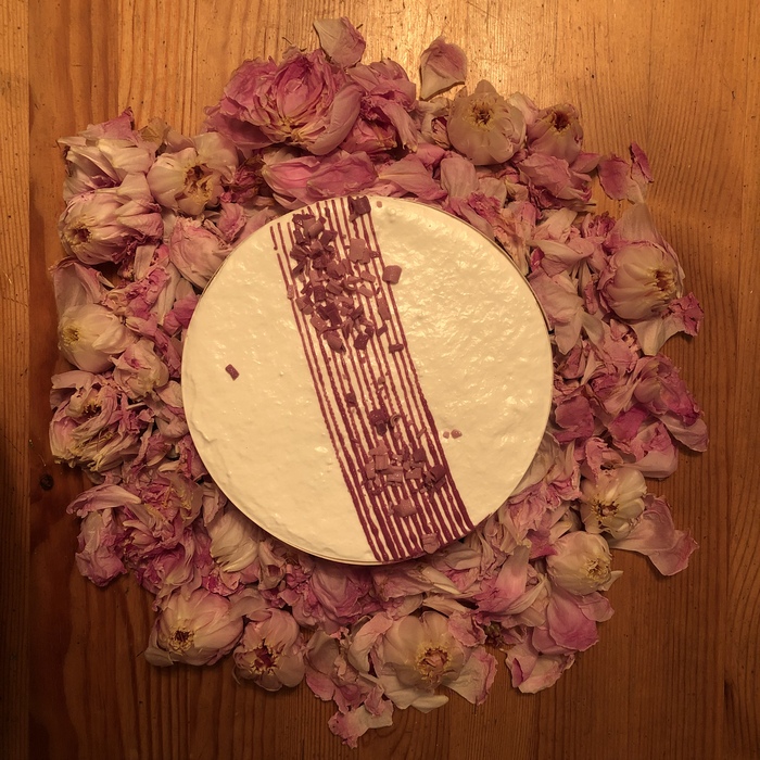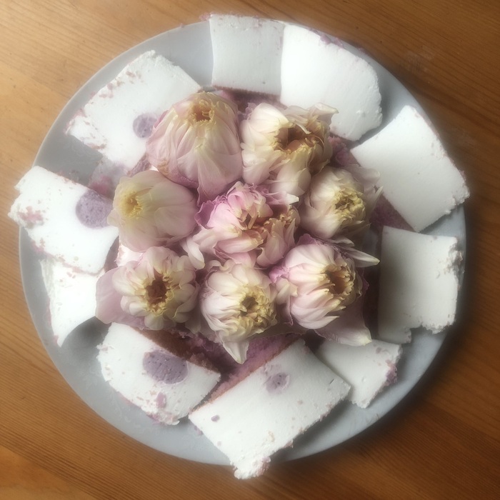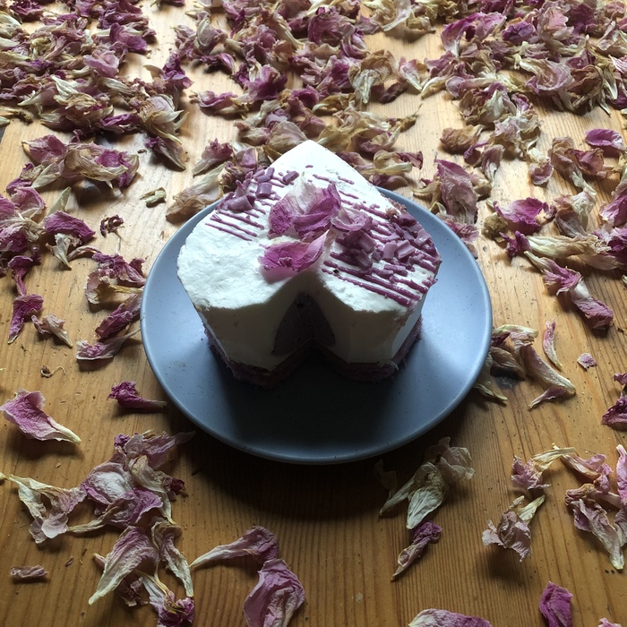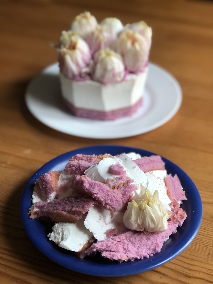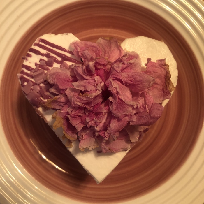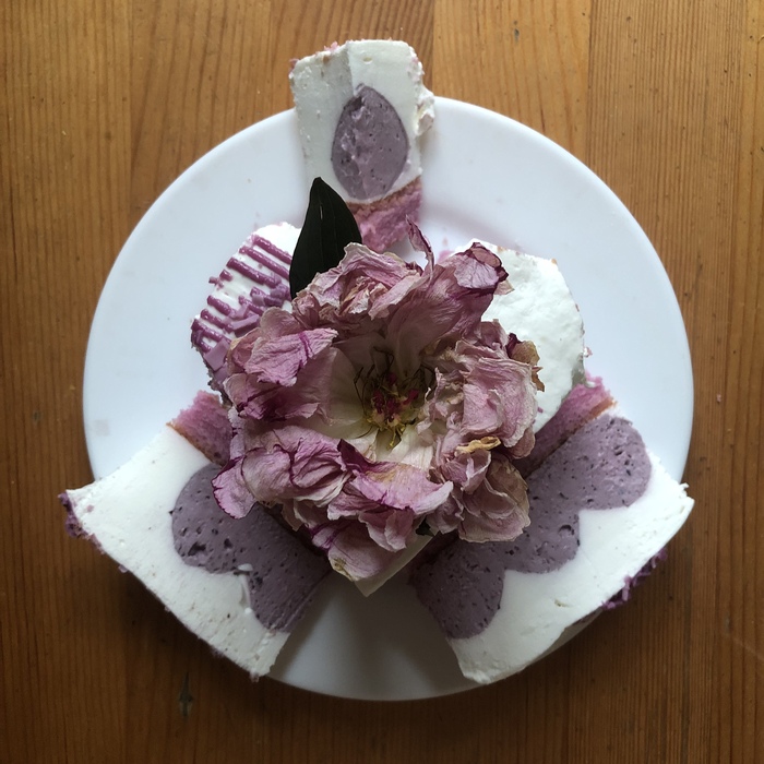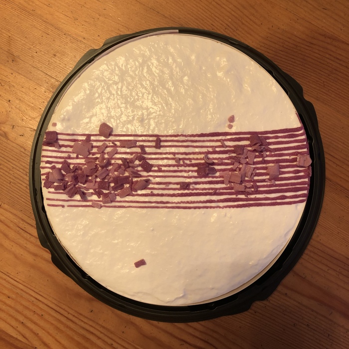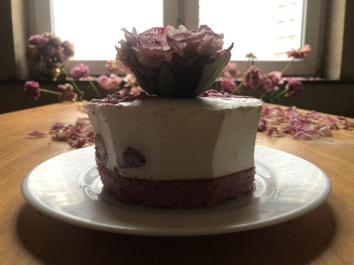 Ванильный бисквит, сливочное суфле и вишневое компоте.