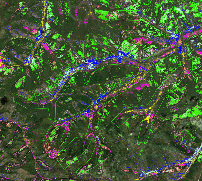 Каждому оттенку соответствует своя минеральная ассоциация или группа минеральных ассоциаций, либо все вместе, но еще и с растительностью. Ярко-желтые участки - уже отработанные россыпи.