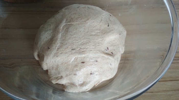 я не знала,как мне оценить результат моих усилий. Вспомнив, что мой одноклассник живет в Германии. я выслала ему фото хлеба, и описала его, попросив описать, какой этот хлеб в Германии. На что получила ответ : "Примерно так он и выглядит, выпекается при низких температурах. Внутри влажный и липкий, чем-то напоминает наш бородинский, но сырее. В бундесверовских сухпаях был раньше, упакованный в цилиндрической дозе, такие круглые шайбы." Ответ меня порадовал и укрепил в мысли что я на верном пути. Так же я все-таки нашла англоязычный вариант этого рецепта, который был взят из книги Джеффри Хамельмана, и нашла, где в русскоязычном варианте кое-что недопечатали. А недопечатали там то, что ржаные хлопья надо замочить. В моей книге этого нет, и я просто не стала использовать эти хлопья подумав, что наверное их ошибочно внесли в рецептуру.