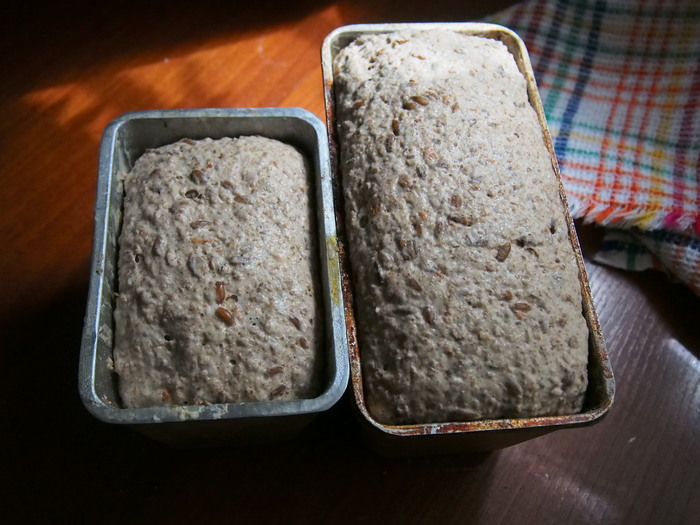 В этот раз я пшеничной муки добавила побольше, пока тесто не перестало быть совсем влажным. Изначально я планировала выпекать хлеб в маленьких формах, в которые входит по 650 гр ржаного теста, и рассчитывала рецепт именно для двух форм. Но так как я не учла воду, которую впитают зерна и всё остальное, и муку которую пришлось досыпать, при перекладывании в формы я поняла, что тесто в эти маленькие формы не войдет , и взяла одну большую, короче ошиблась я с размером форм, в результате перед посадкой в печь вот так все выглядело. В следующий раз возму две большие формы. По рецепту, поднявшееся тесто должно не доходить до края форм на 2 см. У меня до краёв дошло.