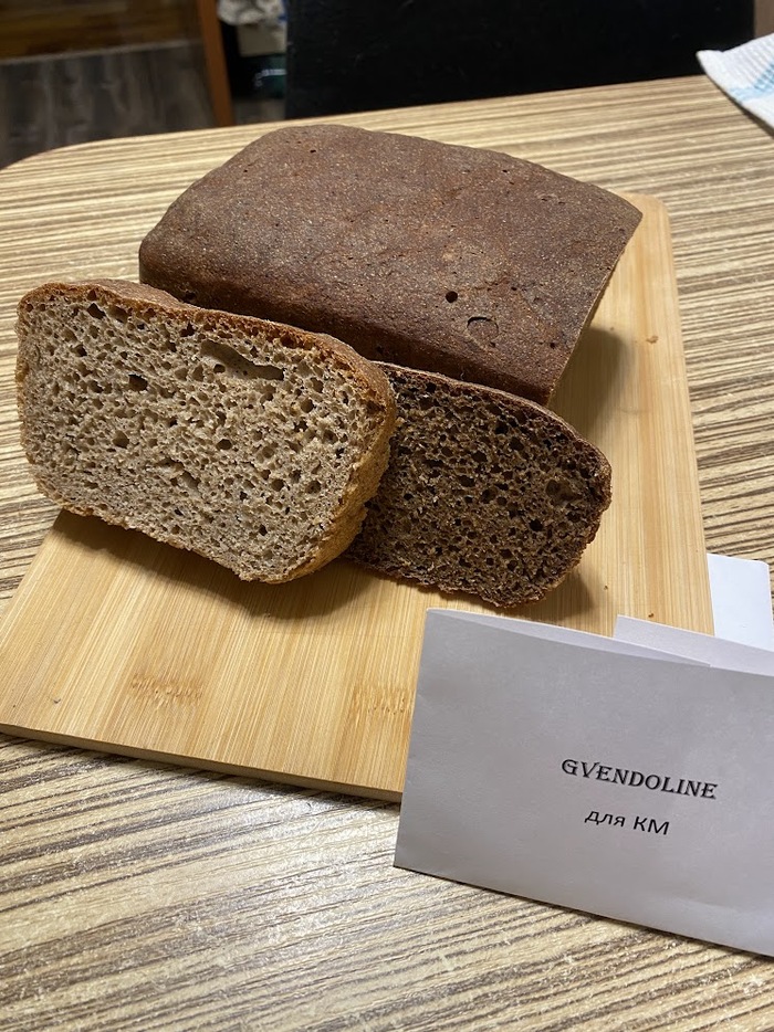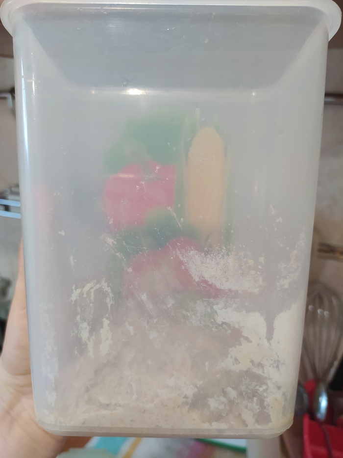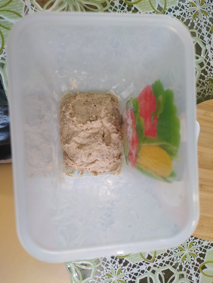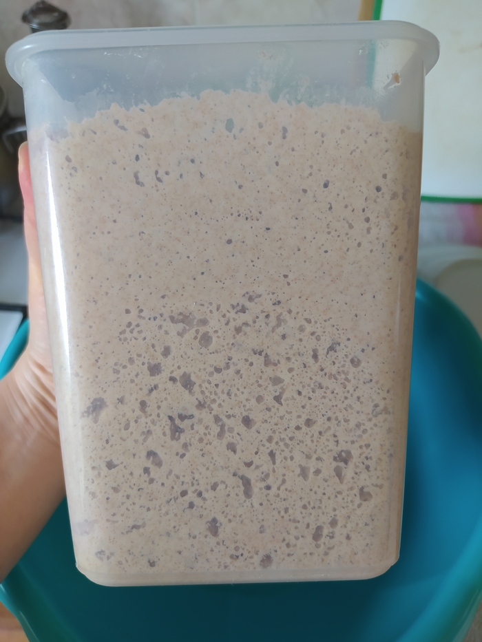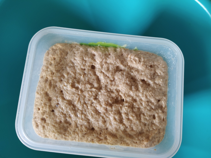 Кто не знает, как освежаем. Мы в закваску сначала наливаем воду, хорошо перемешиваем, потом добавляем муку, вымешиваем до консистенции очень густой сметаны (когда она такая густая, как масло). Я делаю сразу в лоточке высоком, литра на полтора. Закрываю крышкой, воздуха закваске хватит, и она не заветрится.