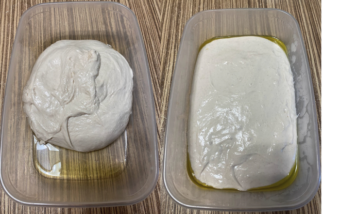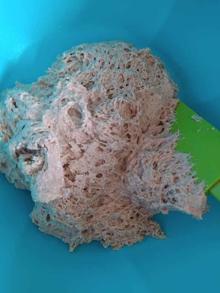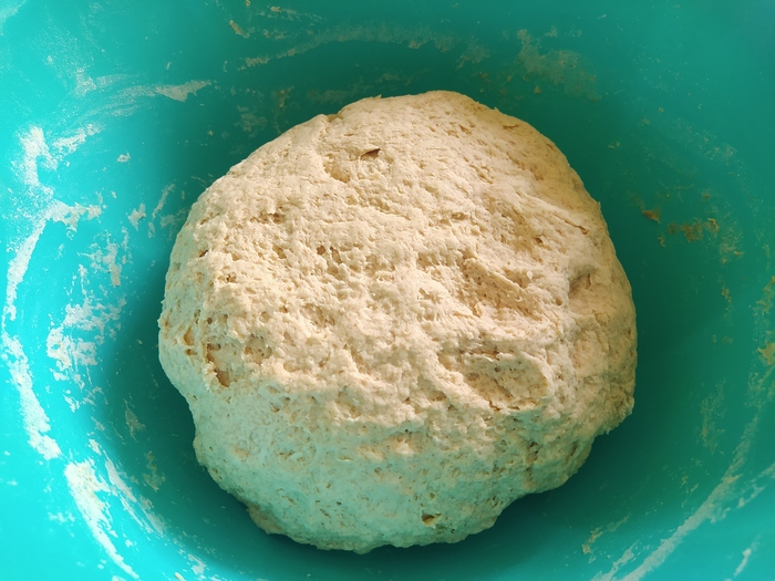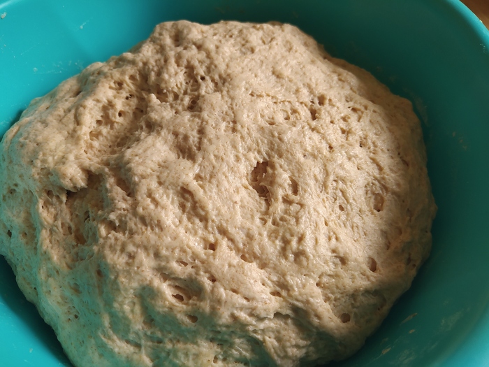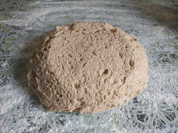Опару соединяем с водой, хорошо размешиваем, после этого добавляем всю муку, вымешиваем. Оставляем на полчаса на аутолиз.