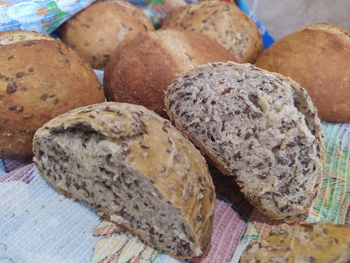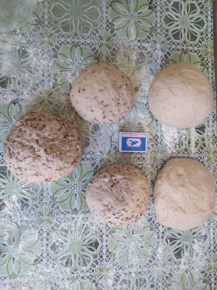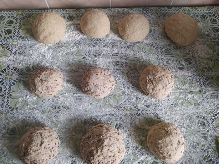 Когда тесто поднялось, я на этом этапе добавляю орешки или семечки, если душа просит. После делю тесто на части, тут зависит от того какого размера я хочу хлеб. Чаще всего делю на 8-10 частей, получается не очень большие булочки. В этот раз я половину сделала без добавок, во вторую половину добавила льняных семечек, грамм 150.