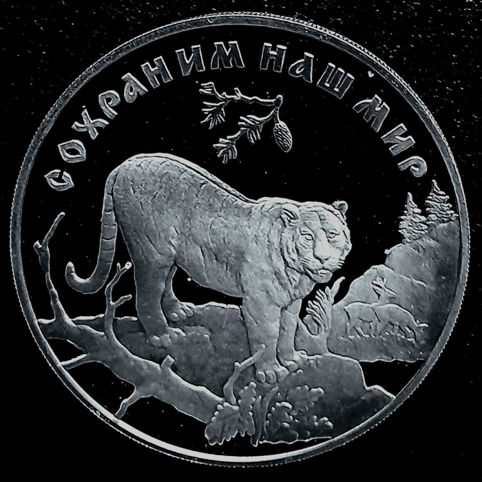 Эта монета выпущена в 1996 году в рамках серии "Сохраним наш мир". На монете изображение амурского тигра возле упавшего дерева и оленей у водоёма у подножия скалы.