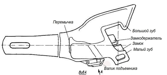 Вид спереди. Посередине хорошо виден замок (большой элемент) и замкодержатель (элемент меньше)