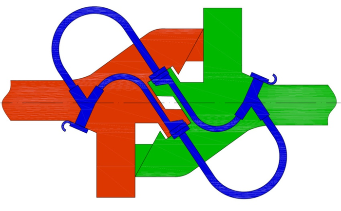 Отлично видно, как нижняя часть сцепки охватывает ответную сцепку — с другой стороны то же самое. Это самое (а ещё небольшие зубья внутри самой «бороды» между контакторов и пневмокранов) и фиксирует одну сцепку относительно другой, придавая системе жёсткость.