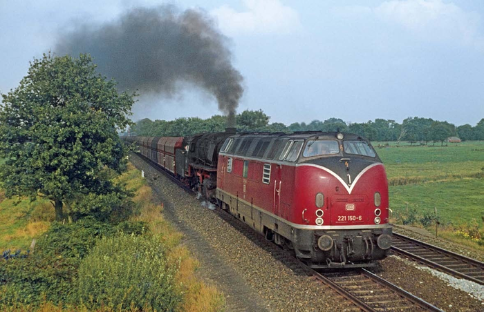 Поделюсь с вами довольно редкой фоточкой из моей коллекции — как тягали уголь в Саар в 70-е. Дизелёк 220-й серии (сами немцы называли его Bierbauch, «пивное пузо») с помощью паровоза невыясненной модели — скорее всего это BR23 в последние годы своей работы на грузовых линиях, но точно узнать не могу — тянет хопперы в Диллинген, Фёльклинген, Саарбрюкен или Боус