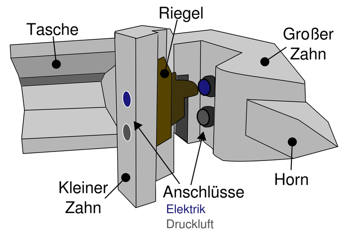 Вот, собственно, схема. Großer Zahn — большой зуб, Kleiner Zahn — малый зуб, Anschlüsse — электро- и пневмосоединения, Riegel — замок, Horn — стопор, Tasche — паз стопора. Жёсткость сцепки как раз и обеспечивается взаимодействием стопора одной сцепки и паза другой