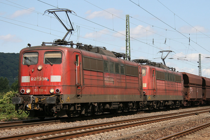 Слегка помятые жизнью BR 151 с AK69e в двойной тяге ведут поезд хопперов