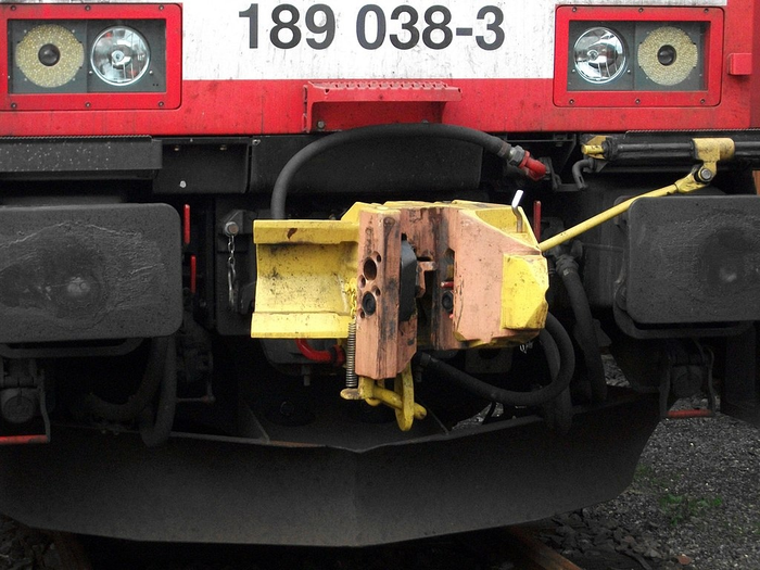 C-AKv на локомотиве DB BR189 за номером 038-3 крупным планом. Такие же локи DB Schenker мучает уже 10-й год. Дырки внутри сцепки — пневмо- и электроконтакты