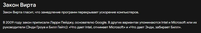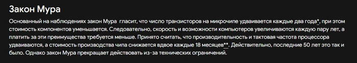 Закон Мура гласил, что каждые 2 года количество транзисторов, упихиваемых в чип, будет удваиваться. Сначала темп был чуть выше, потом замедлился, сейчас замедлился ещё сильнее, но худо-бедно пока действует. Закон Деннарда известен куда меньше, вот одна из его формулировок: при переходе на следующий техпроцесс (в 1,5 раза меньше "нанометров"), на ту же площадь получится разместить вдвое больше транзисторов, при этом мы можем поднять тактовую частоту на 40% и остаться при том же тепловыделении на единицу площади! Именно это мы наблюдали поначалу: росли тактовые частоты, но также росли возможности процессоров - с 8- и 16-битных переходили на 32-битные и потом на 64-битные, появлялись всё новые и новые команды: плавающая запятая, всевозможные MMX, 3DNow, SSE, AVX и пр. Компьютер, которому исполнилось хотя бы несколько лет, уже казался безнадёжно устаревшим, поскольку новый был по всем параметрам лучше.