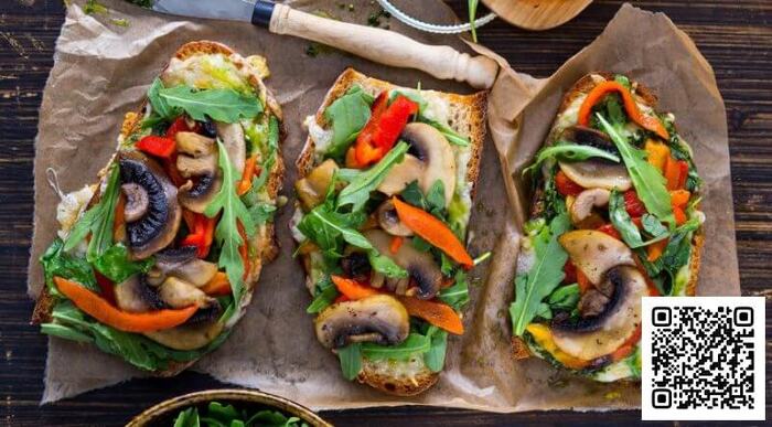 Переложите хлеб на блюдо и смажьте соусом песто. Выложите печеный перец, руколу и обжаренные грибы. Подавайте бутерброды горячими.
