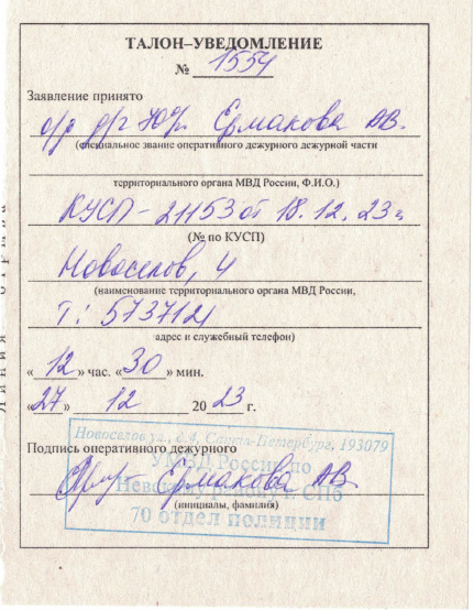 70 отделение полиции г. Санкт-Петербурга, видимо работает по принципу из 90-х, будет труп, тогда начнем шевелиться и что-то делать.