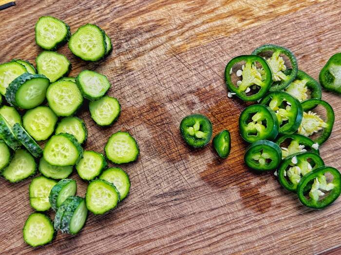 Огурцы и халапеньо нарезать кружочками. По количеству халапеньо — тут нужно регулировать под себя. Если у вас уже «рот испорчен», как говорит моя жена, добавляйте побольше. Если нет, то начинайте с небольшого количества.