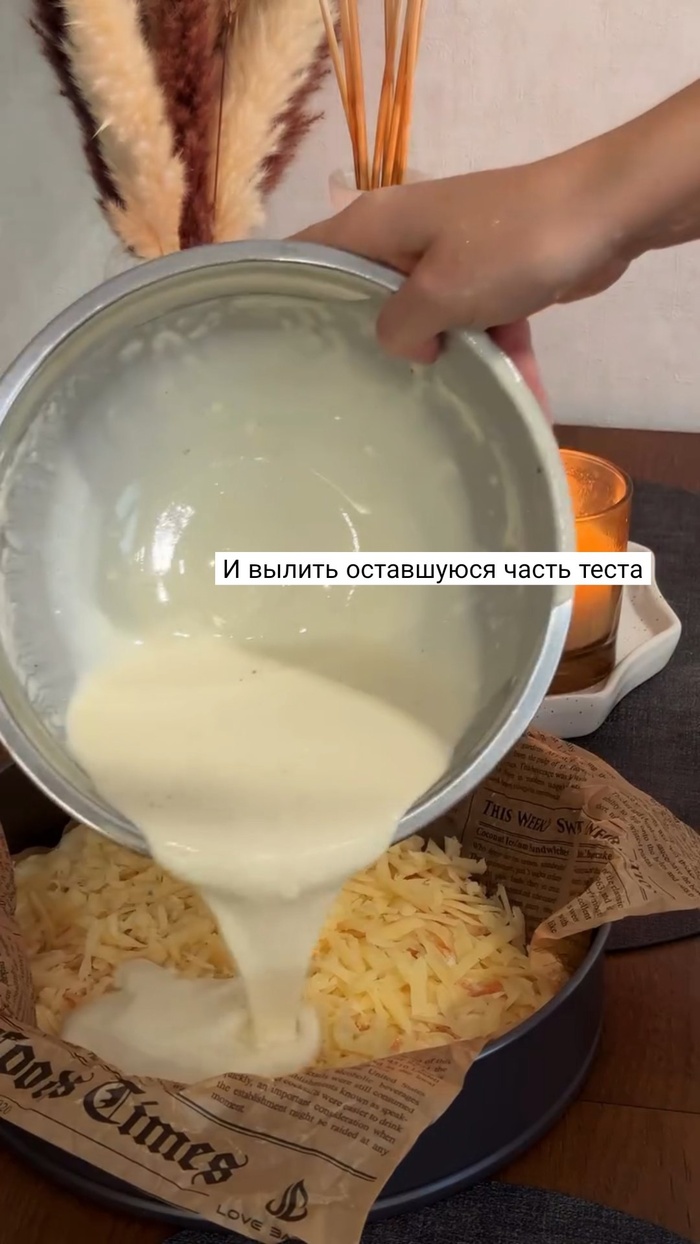 Выливаем половину теста, сверху выкладываем начинку и заливаем второй половиной теста.