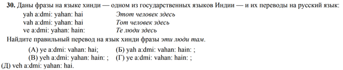 Вот мы уже можем сделать половину из требуемого задания (напоминаю, что нам нужно перевести предложение "Эти люди там": ye ... ... hain. Что делать дальше? Обращаем внимание, что тут у нас появилось какое-то незнакомое слово "там", которого не было в задаче. Чо делать? Сложный вариант: смотрим, что у нас "здесь-там" отличаются так же, как "этот-тот", вспоминаем, что до этого видели yahan:, и такие: ну все, "там" - это vahan:! Промежуточный вывод: "люди" - это a:dmi:. Простой вариант: посмотреть в варианты ответа и увидеть, что там есть vahan:, ну и особо не париться.