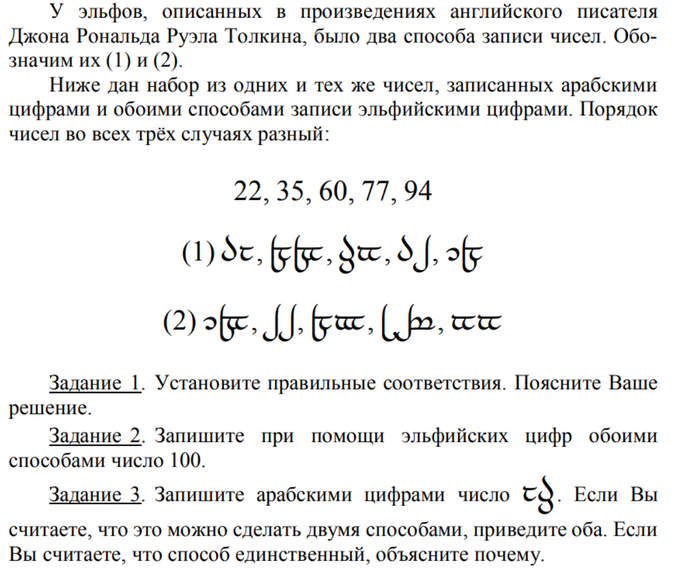 Да, задачи на эльфийский тоже можно (он же тоже язык, пусть и искусственный, а Толкин хорошо постарался в его разработке). Да, тут нет вариантов ответа, весь ход решения юному лингвисту предстоит описывать самостоятельно на листике. Нет, я не буду сейчас описывать, как она решается, но ниже спойлером будет ответ.