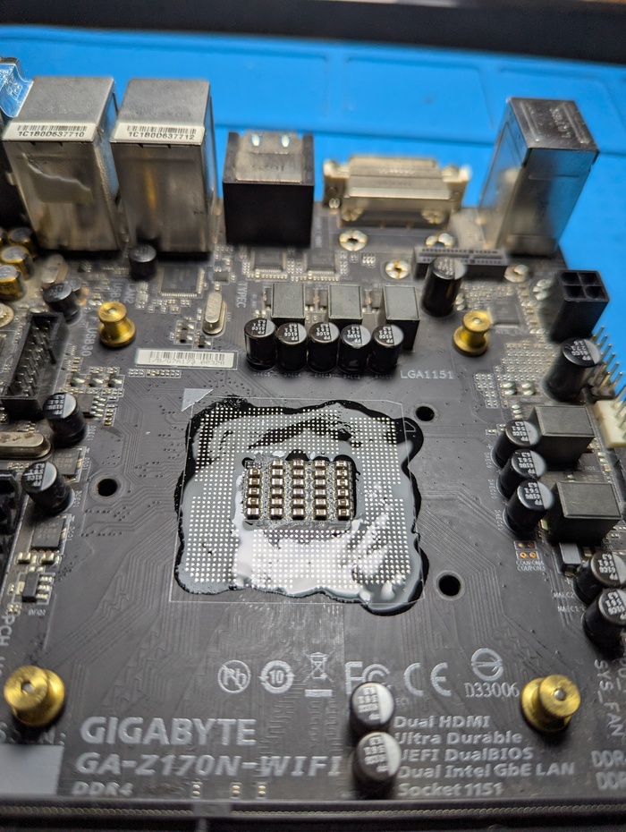 3 косяк - флюс наносят не на плату в таких безумных количествах, а на сокет, на плату мажут совсем чуть-чуть